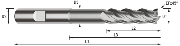 4-skärig solid pinnfräs avsedd för högpresterande fräsning (HPC) och kan användas för både grov- och finbearbetning beroende på applikationen. Verktyget är speciellt utformat för bearbetning av stål och gjutjärn och rekommenderas för högpresterande fräsoperationer.