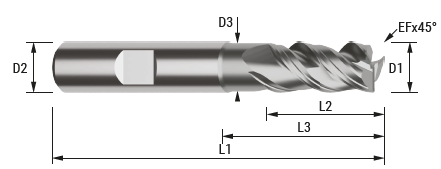 3-skärig solid pinnfräs avsedd för högpresterande fräsning (HPC) och kan användas för både grov- och finbearbetning beroende på applikationen. Verktyget är speciellt utformat för bearbetning av stål och gjutjärn och rekommenderas för högpresterande fräsoperationer.